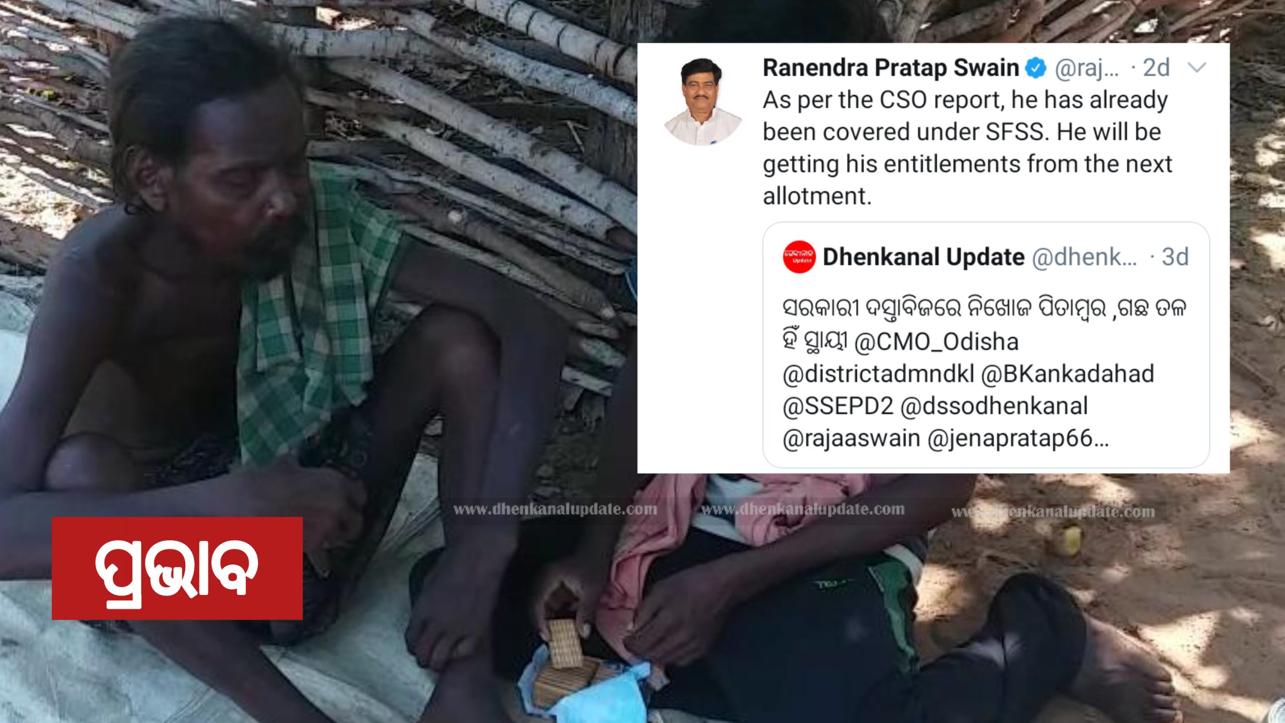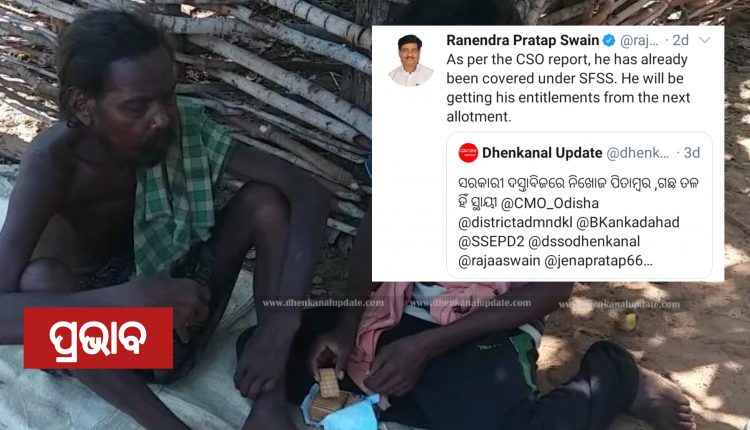 ଏ ନେଇ କିଛିଦିନ ତଳେ ଢେଙ୍କାନାଳ ଅପଡେଟ ରେ ଖବର ପ୍ରସାରଣ ହୋଇଥିଲା । ଖବର ପ୍ରସାରଣ ପରେ ମନ୍ତ୍ରୀ ରାଜା ସ୍ୱାଇଁ ଟ୍ୱିଟ କରି ପିତାମ୍ବର ଙ୍କୁ ତୁରନ୍ତ ଖାଦ୍ୟ ଯୋଗାଣରେ ଅନ୍ତର୍ଭୁକ୍ତ କରିବା ସହ ସରକାରୀ ସହାୟତା ଯୋଗାଇ ଦିଆଯିବ ବୋଲି ଜଣାଇଛନ୍ତି ।